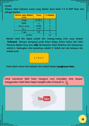 Adapun tabel frekuensi warna yang disukai siswa kelas 7-3 di SMP Maju Jaya