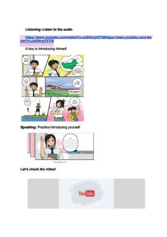 Listening: Listen to the audio https://www.youtube.com/watch?v=JeBNnqV27QIhttps://www.youtube.com/wa tch?v=JeBNnqV27QI A boy is Introducing himself Speaking: Practice introducing yourself Let’s check the video!