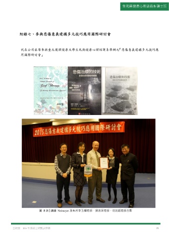 生死與健康心理諮商系碩士班 附錄七、參與悲傷意義建構多元技巧應用國際研討會 代表公司出席參與臺北護理健康大學生死與健康心理諮商系舉辦之『悲傷意義建構多元技巧應 用國際研討會』 圖 8 與│講師 Neimeyer 及系所李玉嬋老師、吳庶深老師、范班超老師合影 呂玟慧 115 年度碩士班甄試申請 25