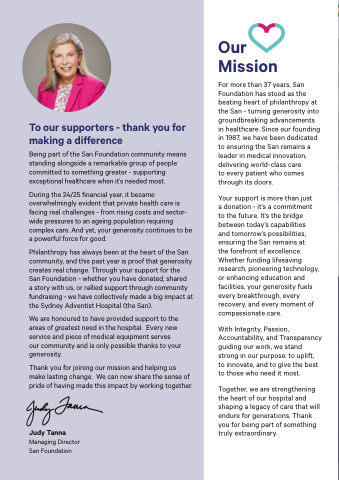 During the 24/25 financial year, it became overwhelmingly evident that private health care is facing real challenges - from rising costs and sector- wide pressures to an ageing population requiring complex care. And yet, your generosity continues to be a powerful force for good.