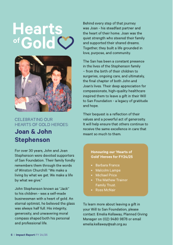To learn more about leaving a gift in your Will to San Foundation, please contact: Emelia Kellaway, Planned Giving Manager on (02) 9480 9878 or email emelia.kellaway@sah.org.au