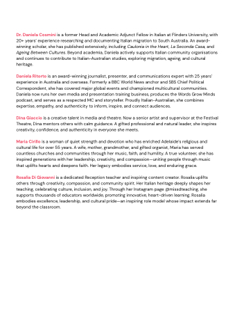 Dr. Daniela Cosmini is a former Head and Academic Adjunct Fellow in Italian at Flinders University, with 20+ years’ experience researching and documenting Italian migration to South Australia. An award- winning scholar, she has published extensively, including Caulonia in the Heart, La Seconda Casa, and Ageing Between Cultures. Beyond academia, Daniela actively supports Italian community organisations and continues to contribute to Italian-Australian studies, exploring migration, ageing, and cultural heritage.