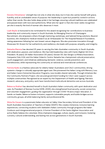 Natasha Marona has devoted 25 years to serving the Italo-Australian community in South Australia with dedication, passion, and resilience. She has held leadership roles with Dante Alighieri SA (Vice President, 18 years), SA Italian Association (10 years), Giovani SA, San Giorgio La Molara Association, Campania Club, It.SA, and the Italian Didactic Centre. Natasha has championed cultural preservation, youth engagement, and initiatives addressing domestic violence, suicide prevention, and homelessness, while representing the community at national and international conferences.