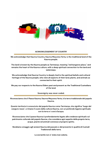 Riconosciamo che il paese Kaurna è profondamente legato alle credenze spirituali e al patrimonio culturale del popolo Kaurna, che considera ogni aspetto della propria terra, acque, piante ed animali connesso al proprio spirito.