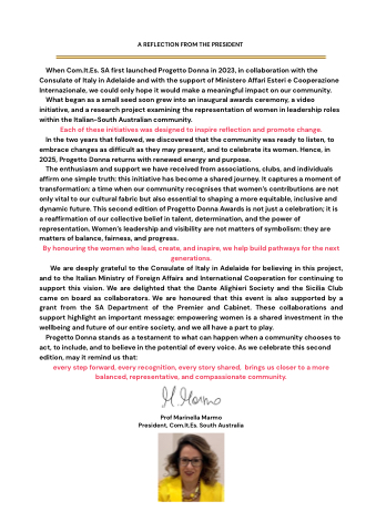 We are deeply grateful to the Consulate of Italy in Adelaide for believing in this project, and to the Italian Ministry of Foreign Affairs and International Cooperation for continuing to support this vision. We are delighted that the Dante Alighieri Society and the Sicilia Club came on board as collaborators. We are honoured that this event is also supported by a grant from the SA Department of the Premier and Cabinet. These collaborations and support highlight an important message: empowering women is a shared investment in the wellbeing and future of our entire society, and we all have a part to play.