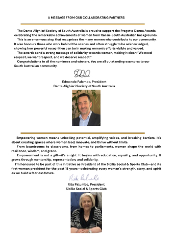 The Dante Alighieri Society of South Australia is proud to support the Progetto Donna Awards, celebrating the remarkable achievements of women from Italian-South Australian backgrounds.