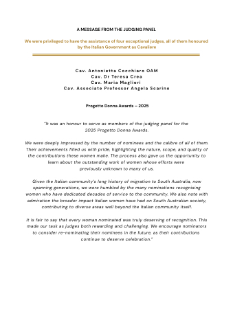 Given the Italian community’s long history of migration to South Australia, now spanning generations, we were humbled by the many nominations recognising women who have dedicated decades of service to the community. We also note with admiration the broader impact Italian women have had on South Australian society, contributing to diverse areas well beyond the Italian community itself.