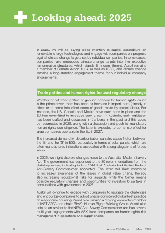 In 2025, we might also see changes made to the Australian Modern Slavery Act. The government has responded to the 30 recommendations from the statutory review, indicating in late 2024 that Australia had its first Federal Anti-Slavery Commissioner appointed. The latter will likely contribute to increased awareness of the issues in global value chains, thereby also increasing reputational risks for laggards, while the former means possible regulatory changes and opportunities for investors to partake in consultations with government in 2025.