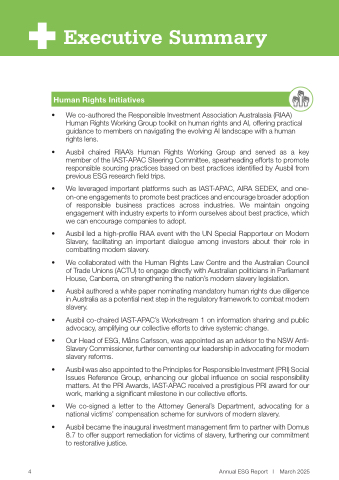 Ausbil was also appointed to the Principles for Responsible Investment (PRI) Social Issues Reference Group, enhancing our global influence on social responsibility matters. At the PRI Awards, IAST-APAC received a prestigious PRI award for our work, marking a significant milestone in our collective efforts.