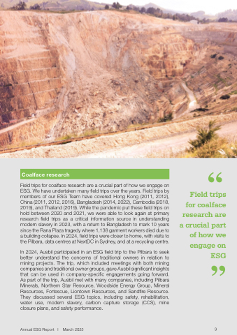 In 2024, Ausbil participated in an ESG field trip to the Pilbara to seek better understand the concerns of traditional owners in relation to mining projects. The trip, which included meetings with both mining companies and traditional owner groups, gave Ausbil significant insights that can be used in company-specific engagements going forward. As part of the trip, Ausbil met with many companies, including Pilbara Minerals, Northern Star Resource, Woodside Energy Group, Mineral Resources, Fortescue, Liontown Resources, and Sandfire Resource. They discussed several ESG topics, including safety, rehabilitation, water use, modern slavery, carbon capture storage (CCS), mine closure plans, and safety performance.