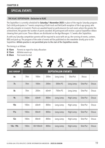The Septathlon is currently scheduled for Saturday 1 November 2025 in place of the regular Saturday program. Each child participates in 7 events comprising of both track and field (with exception of the 6 age group, who will only compete in 6 events). Points are awarded based on performances for each event, where the greater the achievement, the greater the number of points awarded. All participants will receive a special Septathlon ribbon showing their point score. These ribbons are distributed via the Age Managers 1-2 weeks after Septathlon.