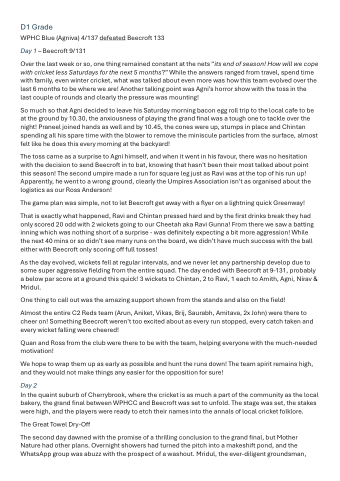 In the quaint suburb of Cherrybrook, where the cricket is as much a part of the community as the local bakery, the grand final between WPHCC and Beecroft was set to unfold. The stage was set, the stakes were high, and the players were ready to etch their names into the annals of local cricket folklore.