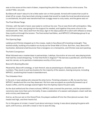 Lakshya and Chintan stepped up to the crease, ready to face Beecroft’s bowling onslaught. They started solidly, building a foundation as sturdy as the Great Wall of China. But then, Issa, Beecroft’s top bowler, delivered a ball bouncier than a kangaroo on a trampoline, and Chintan was sent packing.