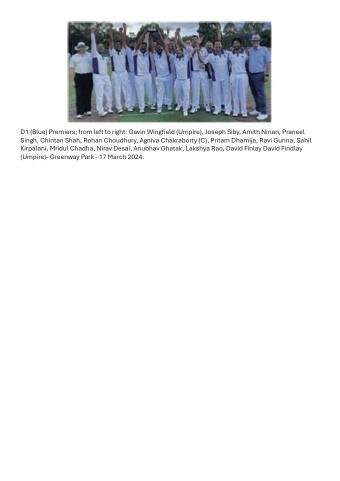 D1 (Blue) Premiers; from left to right: Gavin Wingfield (Umpire), Joseph Siby, Amith Ninan, Praneel Singh, Chintan Shah, Rohan Choudhury, Agniva Chakraborty (C), Pritam Dhamija, Ravi Gunna, Sahil Kirpalani, Mridul Chadha, Nirav Desai, Anubhav Ghatak, Lakshya Rao, David Finlay David Findlay (Umpire)- Greenway Park - 17 March 2024.