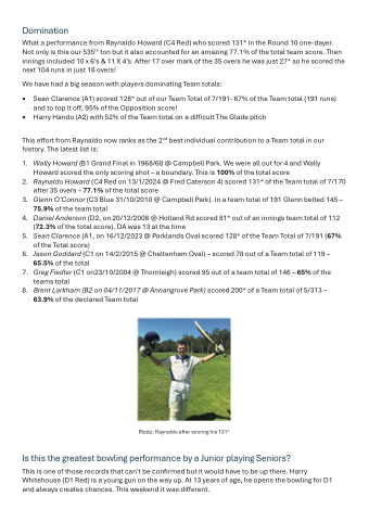 2. Raynaldo Howard (C4 Red on 13/1/2024 @ Fred Caterson 4) scored 131* of the Team total of 7/170 after 35 overs – 77.1% of the total score