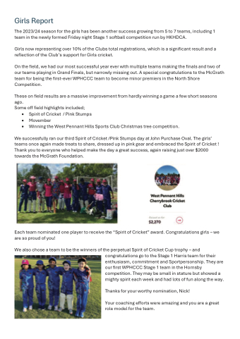 On the field, we had our most successful year ever with multiple teams making the finals and two of our teams playing in Grand Finals, but narrowly missing out. A special congratulations to the McGrath team for being the first-ever WPHCCC team to become minor premiers in the North Shore Competition.