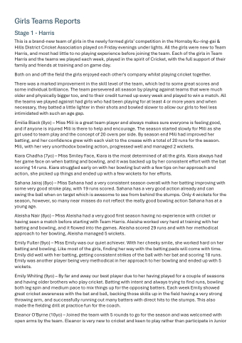 Girls Teams Reports Stage 1 - Harris