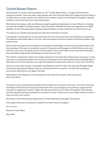 2023/24 saw us conduct and concluded our 32nd Cricket Blast season, a huge achievement for everyone involved. There has been many people over this time that have put a huge amount of effort in to make this a success, the fact we continue each season and go from strength to strength is directly related to all the hard work put in by these people.