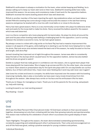 2024 saw the West Pennant Hills Cherrybrook Under 10 Gold team embark on their second season together, showcasing not only their cricketing skill but also their growing maturity and sportsmanship. This season was marked by the celebration of each other’s successes and a great display of team spirit.