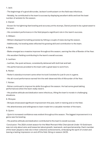 Conclusion: The 2024 cricket season for the West Pennant Hills Cherrybrook Under 10 Gold team was not only about wins and losses but about growth, teamwork, and sportsmanship. Each member of the team played a vital role in their collective achievements, embodying the spirit of cricket and leaving a lasting impression on and off the field. Bring on season 24/25.