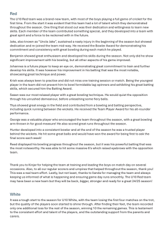 Thank you to Kinjar for helping the team at training and leading the boys on match day on several occasions. Also, to all our regular scorers and umpires that helped throughout the season, thank you! This was a real team effort. Lastly, but not least, thanks to Ilanda for managing the team and always keeping us informed of what is happening and ensuring game day runs smoothly. The U10 Red team may have been a new team but they will be back, bigger, stronger and ready for a great 24/25 season!