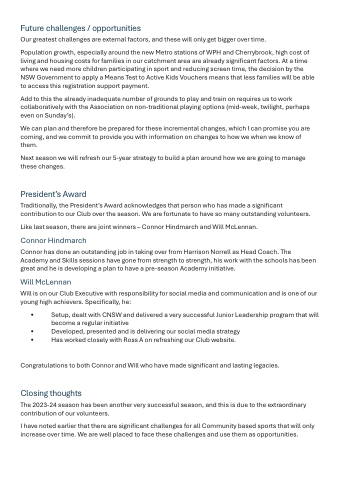 I have noted earlier that there are significant challenges for all Community based sports that will only increase over time. We are well placed to face these challenges and use them as opportunities.