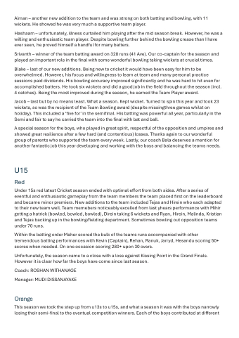 Under 15s red latest Cricket season ended with optimal effort from both sides. After a series of eventful and enthusiastic gameplay from the team members the team placed first on the leaderboard and became minor premiers. New additions to the team included Tejas and Hirein who each adapted to their new team well. Team memebers noticeably excelled from last yhears performance with Mihir getting a hatrick (bowled, bowled, bowled), Direin taking 6 wickets and Ryan, Hirein, Malinda, Kristian and Tejas backing up in the bowling/fielding department. Sometimes bowling out opposition teams under 70 runs.