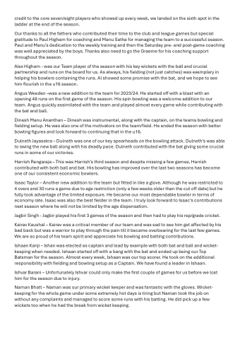 Dinesh Manu Ananthan – Dinesh was instrumental, along with the captain, on the teams bowling and fielding setup. He was also one of the motivators on the team/field. He ended the season with better bowling figures and look forward to continuing that in the u16.