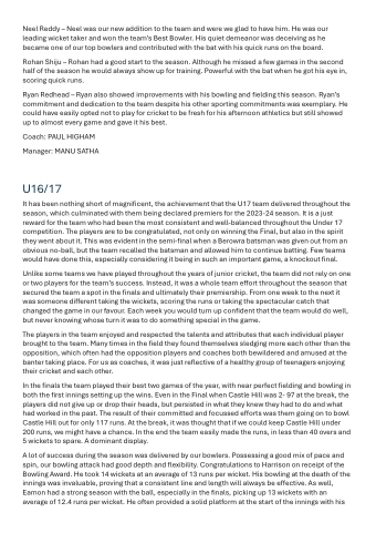 It has been nothing short of magnificent, the achievement that the U17 team delivered throughout the season, which culminated with them being declared premiers for the 2023-24 season. It is a just reward for the team who had been the most consistent and well-balanced throughout the Under 17 competition. The players are to be congratulated, not only on winning the Final, but also in the spirit they went about it. This was evident in the semi-final when a Berowra batsman was given out from an obvious no-ball, but the team recalled the batsman and allowed him to continue batting. Few teams would have done this, especially considering it being in such an important game, a knockout final.