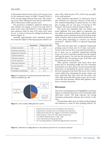 Other general comments units listed about their primes give an interesting insight into how Australian perfusionists view their primes. Six units mentioned the importance of minimising the prime volume in their free text comments at the end of the survey; five of these centres added that minimising the prime volume was more important than what went into the prime. One other reply noted that their prime recipe was very his- torical and that literature offered little guidance other than to minimise the prime.