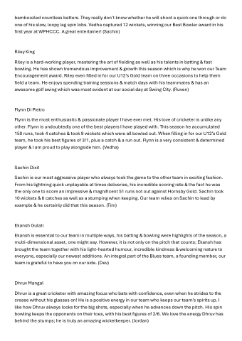 Ekansh is essential to our team in multiple ways, his batting & bowling were highlights of the season, a multi-dimensional asset, one might say. However, it is not only on the pitch that counts; Ekansh has brought the team together with his light-hearted humour, incredible kindness & welcoming nature to everyone, especially our newest additions. An integral part of the Blues team, a founding member, our team is grateful to have you on our side. (Dev)