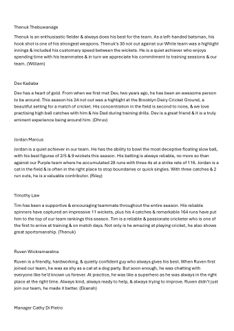 Tim has been a supportive & encouraging teammate throughout the entire season. His reliable spinners have captured an impressive 11 wickets, plus his 4 catches & remarkable 164 runs have put him to the top of our team rankings this season. Tim is a reliable & passionate cricketer who is one of the first to arrive at training & on match days. Not only is he amazing at playing cricket, he also shows great sportsmanship. (Thenuk)