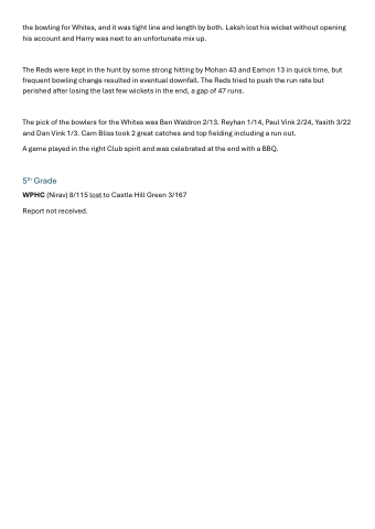 WPHC (Nirav) 8/115 lost to Castle Hill Green 3/167 Report not received.