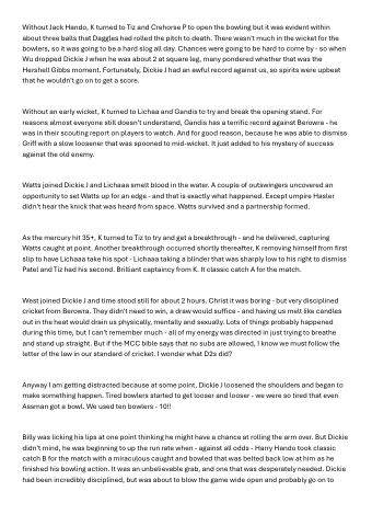 Billy was licking his lips at one point thinking he might have a chance at rolling the arm over. But Dickie didn't mind, he was beginning to up the run rate when - against all odds - Harry Hando took classic catch B for the match with a miraculous caught and bowled that was belted back low at him as he finished his bowling action. It was an unbelievable grab, and one that was desperately needed. Dickie had been incredibly disciplined, but was about to blow the game wide open and probably go on to