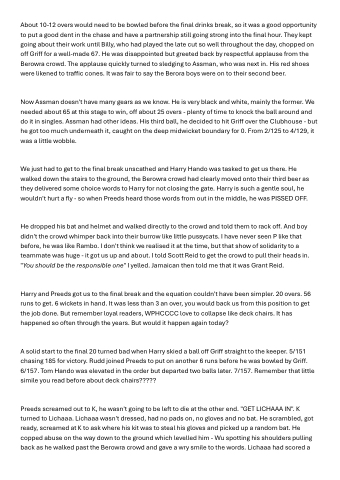 Harry and Preeds got us to the final break and the equation couldn't have been simpler. 20 overs. 56 runs to get. 6 wickets in hand. It was less than 3 an over, you would back us from this position to get the job done. But remember loyal readers, WPHCCCC love to collapse like deck chairs. It has happened so often through the years. But would it happen again today?