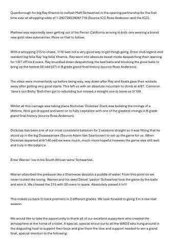 Whilst all this carnage was taking place Nicholas ‘Dickolas’ Duck was building the innings of a lifetime. Nick got dropped and went on to fully capitalise with one of the greatest innings in B grade grand final history (source Ross Anderson).