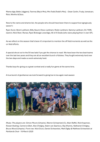 Photo: The players are: Simon Moore (Umpire), Warren Schwartzel (C), Allan Raffel, Rob Knapman, Rowan Keating, Cameron Bish, Alex Chidgey, Adam van Saarloos, Ray Khamis, Nathaniel Chidgey, Bruce Wood (Umpire). Front row: Nick Duck, Daniel Schwartzel, Matt Digby & Matthew Schwartzel at Parklands Oval - 16 March 2025