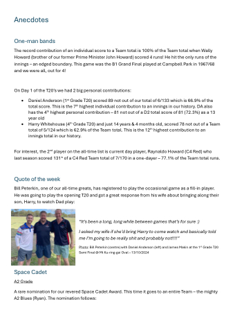 • Daniel Anderson (1st Grade T20) scored 89 not out of our total of 6/133 which is 66.9% of the total score. This is the 7th highest individual contribution to an innings in our history. DA also has the 4th highest personal contribution – 81 not out of a D2 total score of 81 (72.3%) as a 13 year old