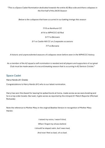 As a member of the A2 squad a self-nomination is needed and all players and supporters of our great Club must be made aware of a record breaking season that is occurring in A2 Seniors Cricket.”