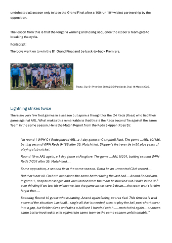 “In round 1 WPH C4 Reds played ARL, a 1 day game at Campbell Park. The game ...ARL 10/186, batting second WPH Reds 9/186 after 35. Match tied. Skipper’s first ever tie in 50 plus years of playing club cricket.