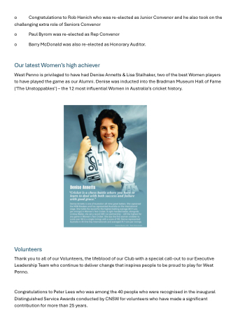 West Penno is privileged to have had Denise Annetts & Lisa Stalhaker, two of the best Women players to have played the game as our Alumni. Denise was inducted into the Bradman Museum Hall of Fame (‘The Unstoppables’) – the 12 most influential Women in Australia’s cricket history.