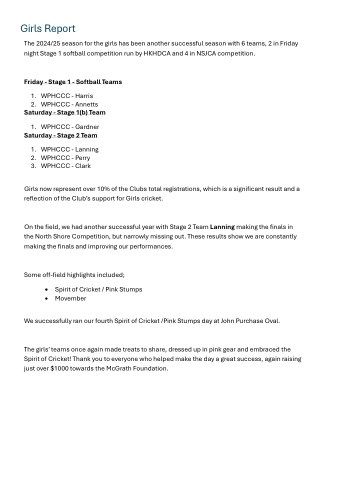 Girls now represent over 10% of the Clubs total registrations, which is a significant result and a reflection of the Club’s support for Girls cricket.