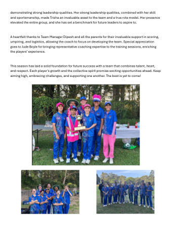A heartfelt thanks to Team Manager Dipesh and all the parents for their invaluable support in scoring, umpiring, and logistics, allowing the coach to focus on developing the team. Special appreciation goes to Jude Boyle for bringing representative coaching expertise to the training sessions, enriching the players’ experience.