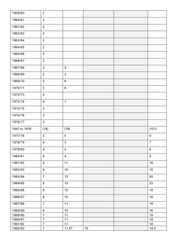 1959/60 2 1960/61 2 1961/62 2 1962/63 2 1963/64 3 1964/65 2 1965/66 3 1966/67 3 1967/68 3 1968/69 2 1969/70 3 1970/71 3 1972/73 4 1973/74 4 1974/75 3 1975/76 3 1976/77 2 1947 to 1976 (74) 1977/78 3 1978/79 4 1979/80 4 1980/81 4 1981/82 5 1982/83 6 1983/84 7 1984/85 8 1985/86 8 1986/87 6 1987/88 7