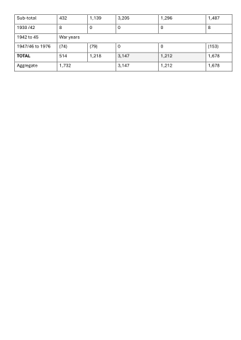 Sub-total 432 1,139 3,205 1,296 1,487 1930 /42 8 0 0 0 8 1942 to 45 War years 1947/46 to 1976 (74) (79) 0 0 (153) TOTAL 514 1,218 3,147 1,212 1,678 Aggregate 1,732 3,147 1,212 1,678