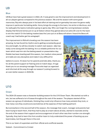 U9 Blue have had a great season in 2024_25. It was great to see the improvement and development in all our players games compared to the previous season. We end the season with some great memories; Raj who always puts in his best effort at training and on gameday has seen his game really improve in particular his batting skills. Henry brings the energy to the team; his smile is infectious, and he really gets the teams motivation going on game day. Who can forget the running between wickets display that Sid and James put on up at Galson where they gained about an extra 20 runs for the team to win the match! Or the batting masterclass the Leon put on at Beecroft where I heard the Beecroft coach say I had better get his autograph!