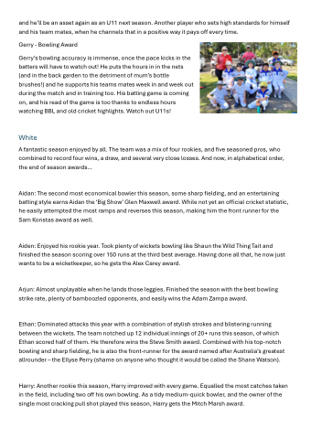 Ethan: Dominated attacks this year with a combination of stylish strokes and blistering running between the wickets. The team notched up 12 individual innings of 20+ runs this season, of which Ethan scored half of them. He therefore wins the Steve Smith award. Combined with his top-notch bowling and sharp fielding, he is also the front-runner for the award named after Australia’s greatest allrounder – the Ellyse Perry (shame on anyone who thought it would be called the Shane Watson).