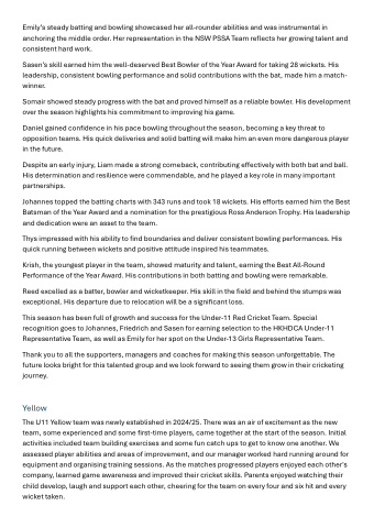 The U11 Yellow team was newly established in 2024/25. There was an air of excitement as the new team, some experienced and some first-time players, came together at the start of the season. Initial activities included team building exercises and some fun catch ups to get to know one another. We assessed player abilities and areas of improvement, and our manager worked hard running around for equipment and organising training sessions. As the matches progressed players enjoyed each other's company, learned game awareness and improved their cricket skills. Parents enjoyed watching their child develop, laugh and support each other, cheering for the team on every four and six hit and every wicket taken.