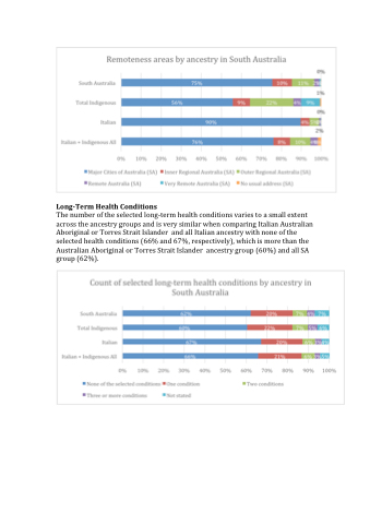The number of the selected long-term health conditions varies to a small extent across the ancestry groups and is very similar when comparing Italian Australian Aboriginal or Torres Strait Islander and all Italian ancestry with none of the selected health conditions (66% and 67%, respectively), which is more than the Australian Aboriginal or Torres Strait Islander ancestry group (60%) and all SA group (62%).
