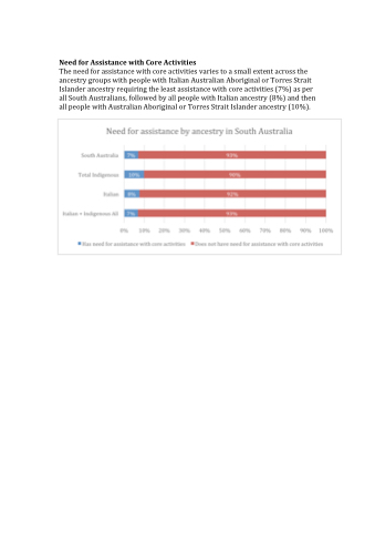 The need for assistance with core activities varies to a small extent across the ancestry groups with people with Italian Australian Aboriginal or Torres Strait Islander ancestry requiring the least assistance with core activities (7%) as per all South Australians, followed by all people with Italian ancestry (8%) and then all people with Australian Aboriginal or Torres Strait Islander ancestry (10%).